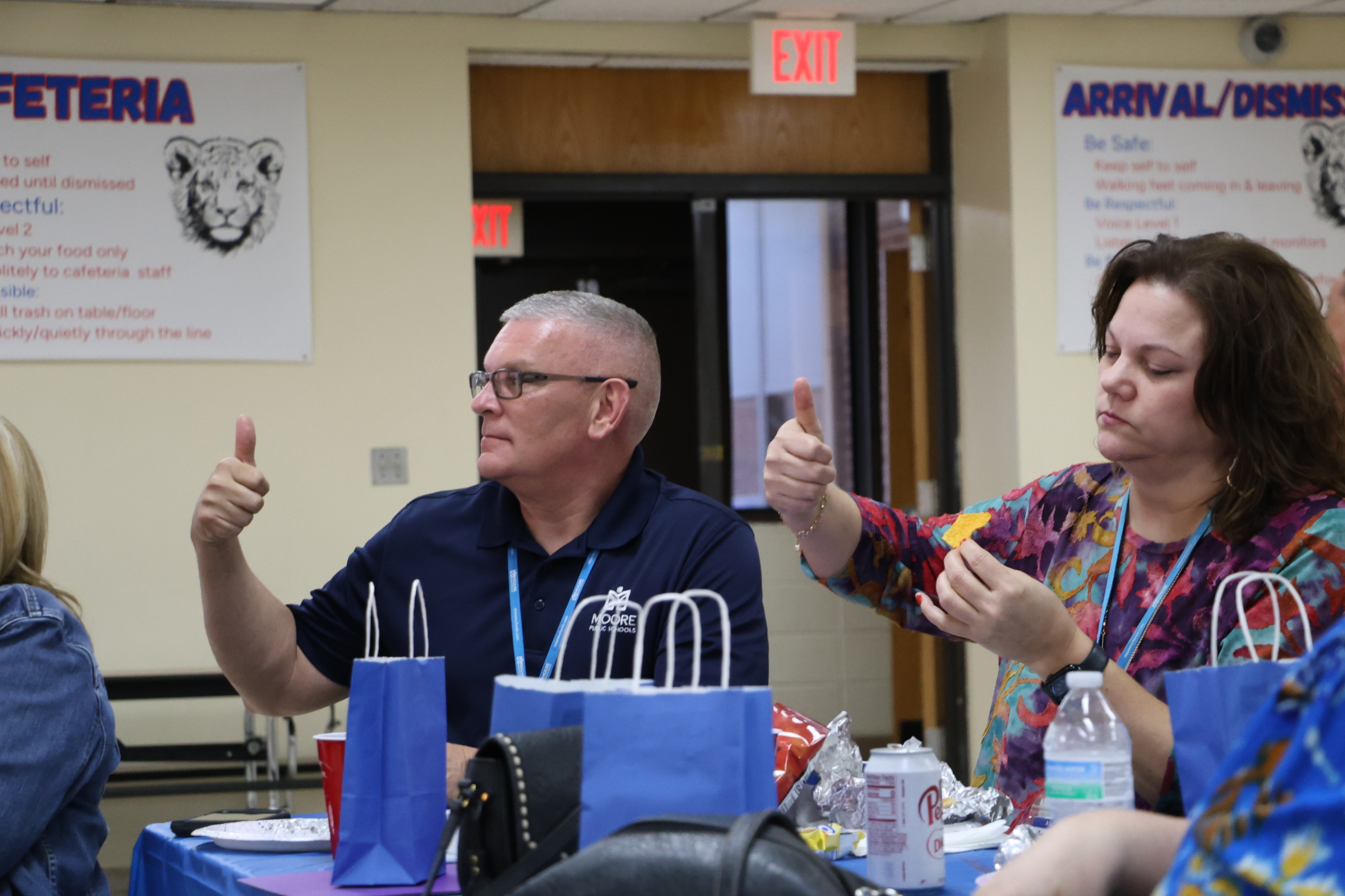 The image shows two people, a man and a woman, standing in what appears to be a school or community center setting, with an %22Exit%22 sign visible in the background.