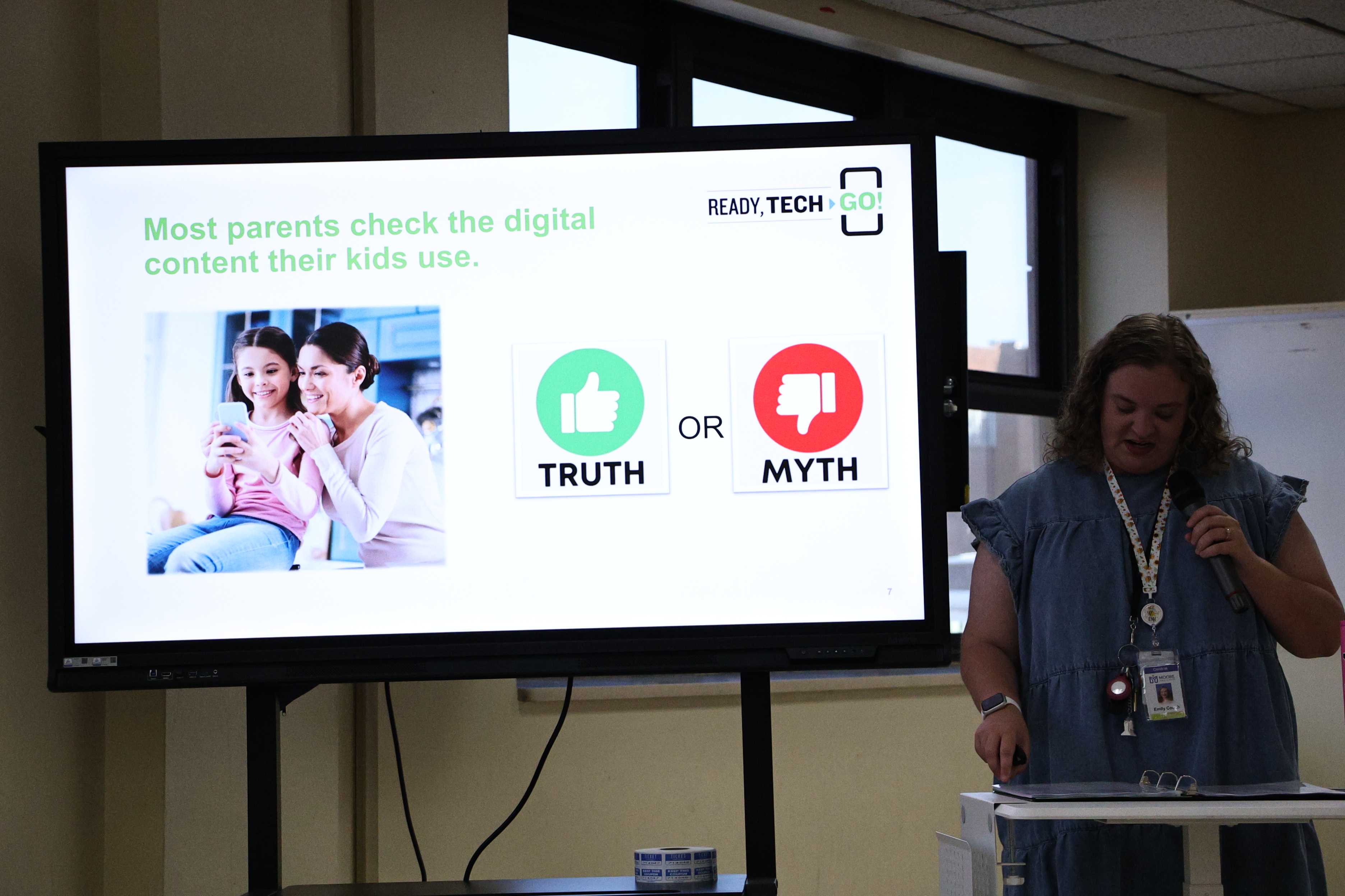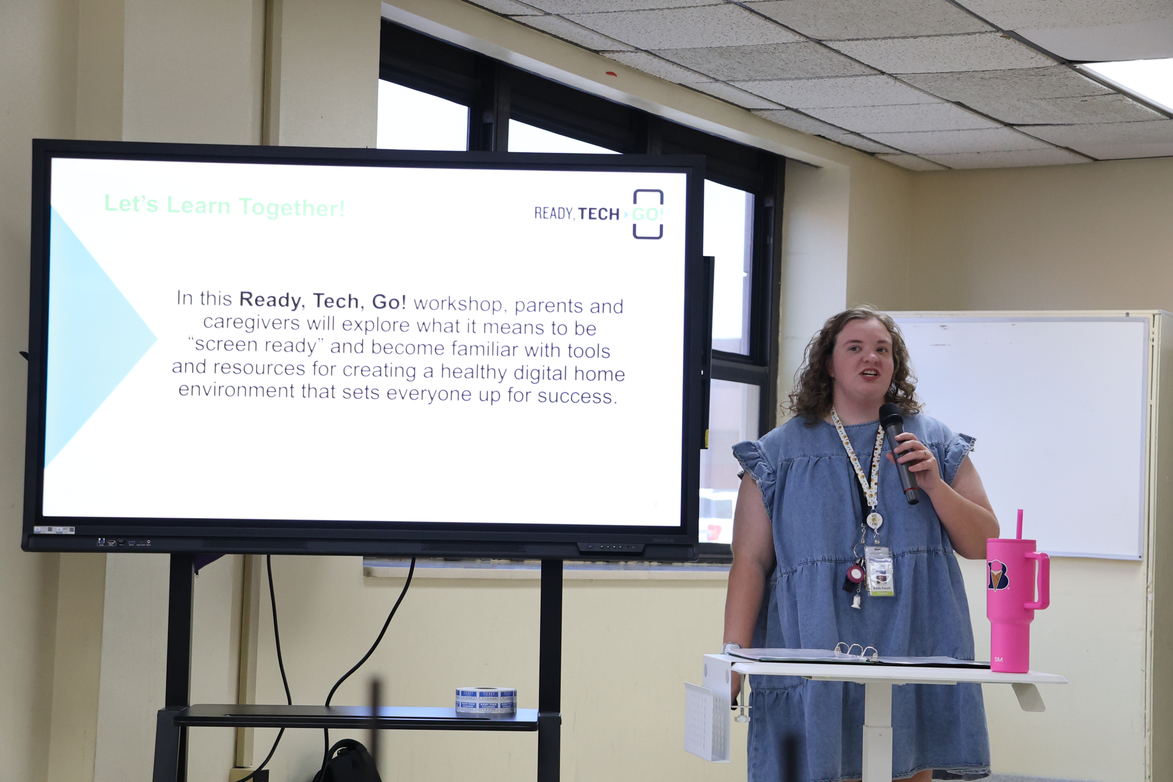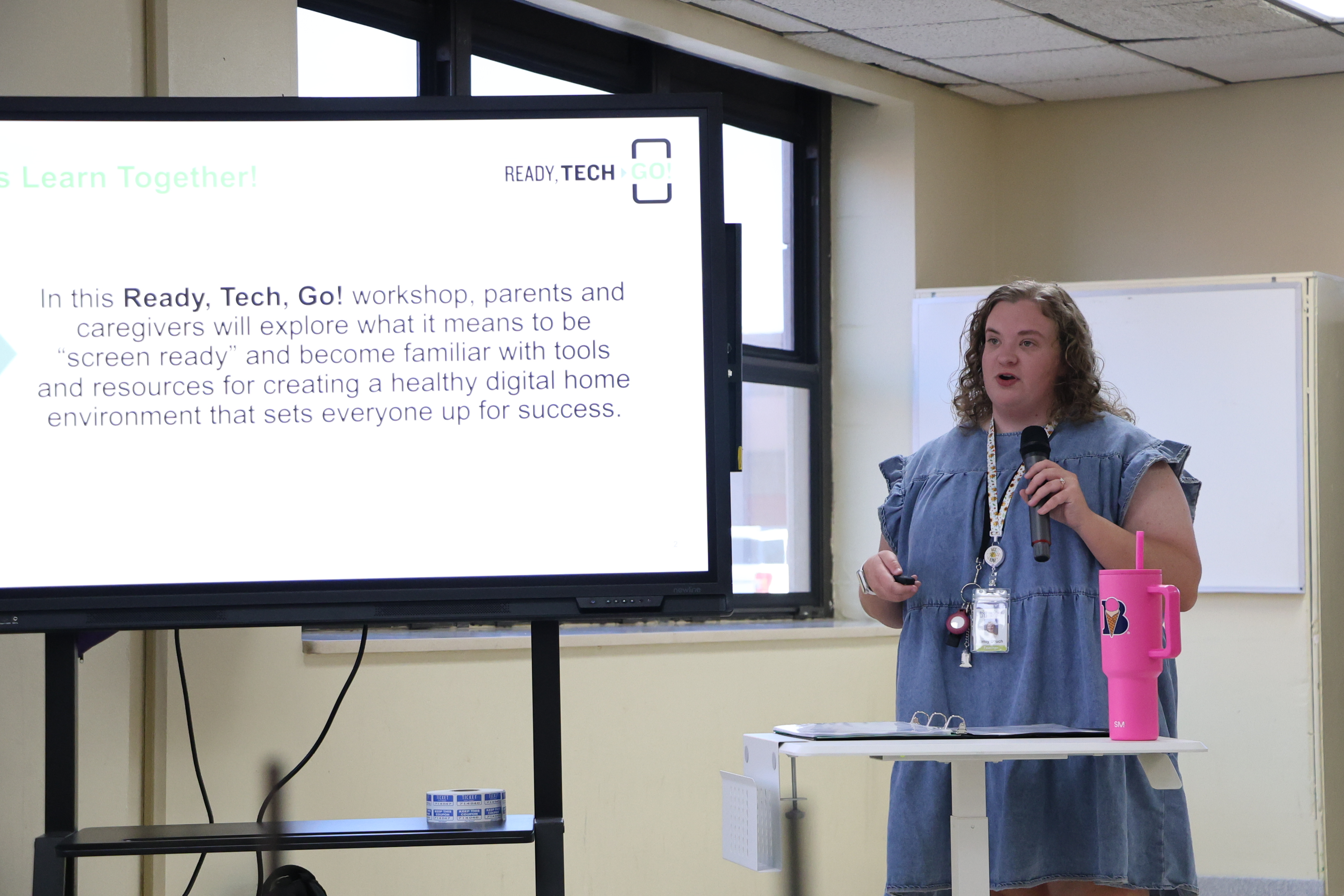 A woman in a blue shirt is standing in front of a projection screen displaying text about a %22Ready Tech. Go!%22 workshop for parents and students.
