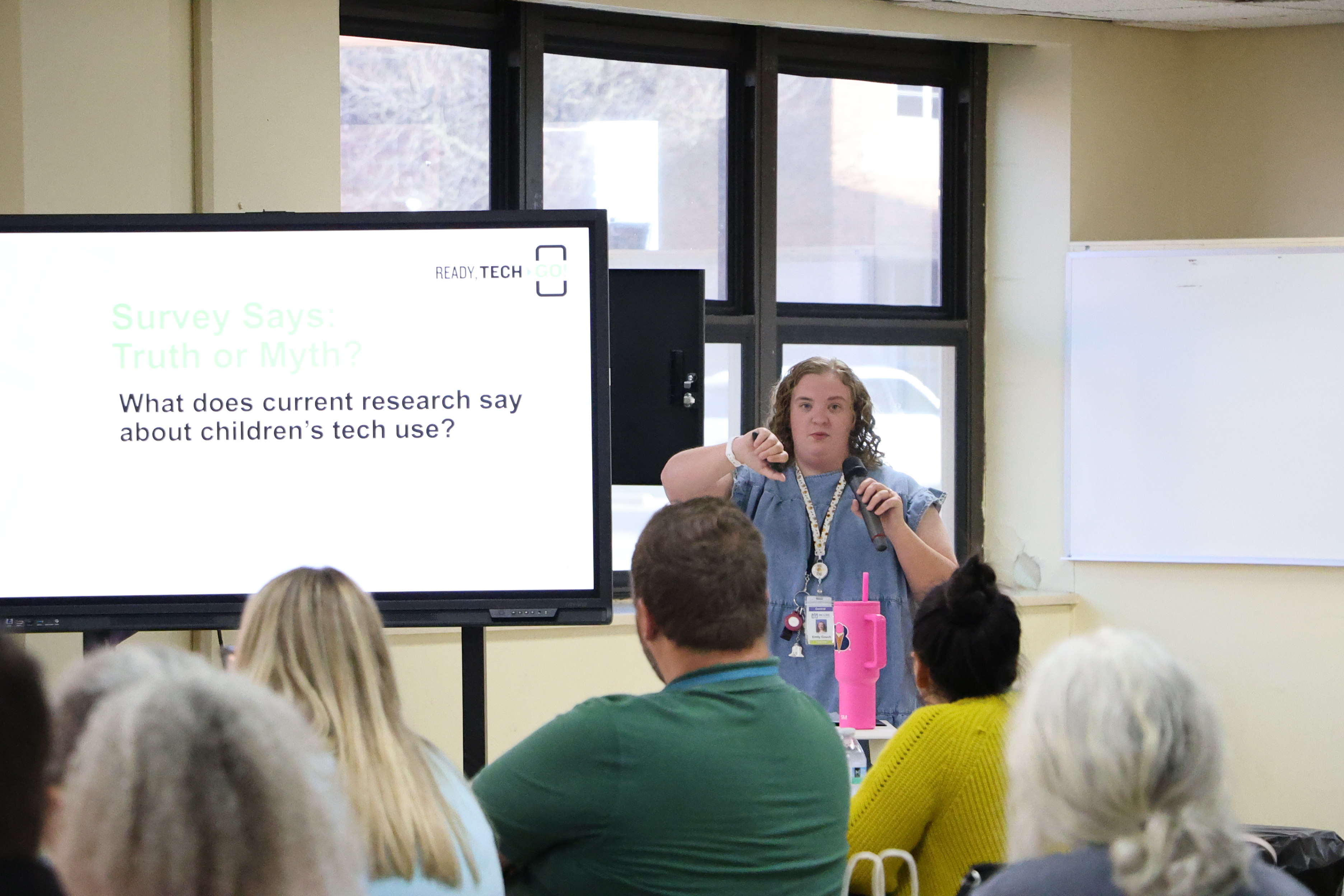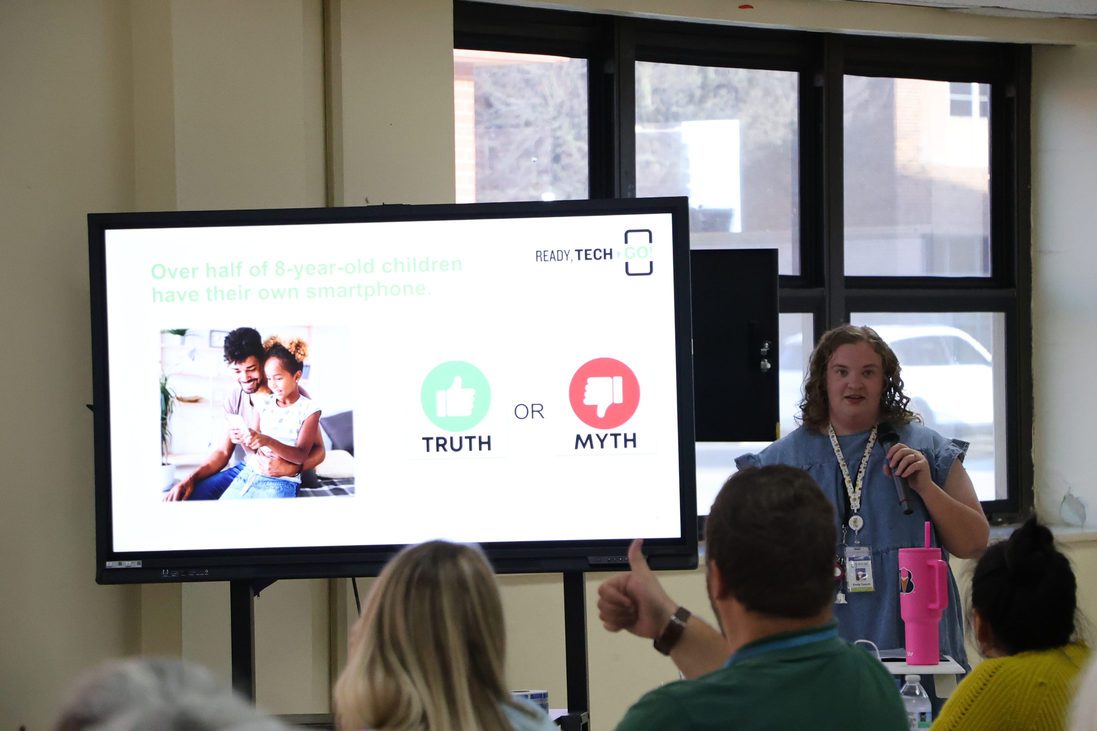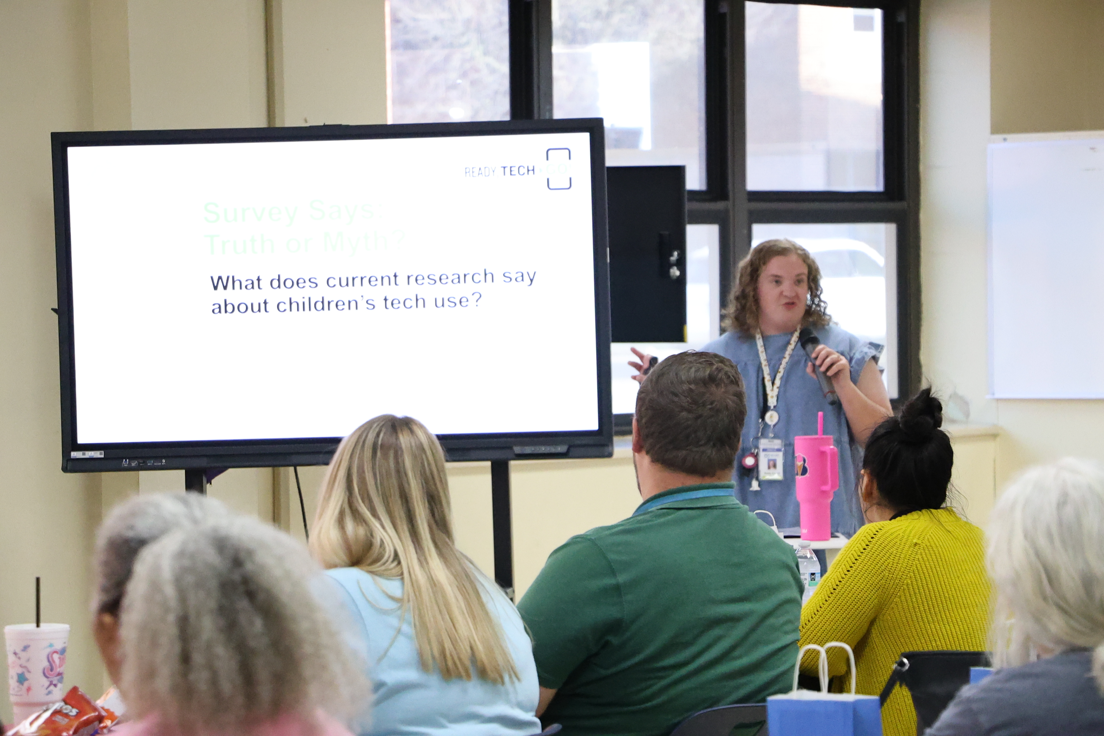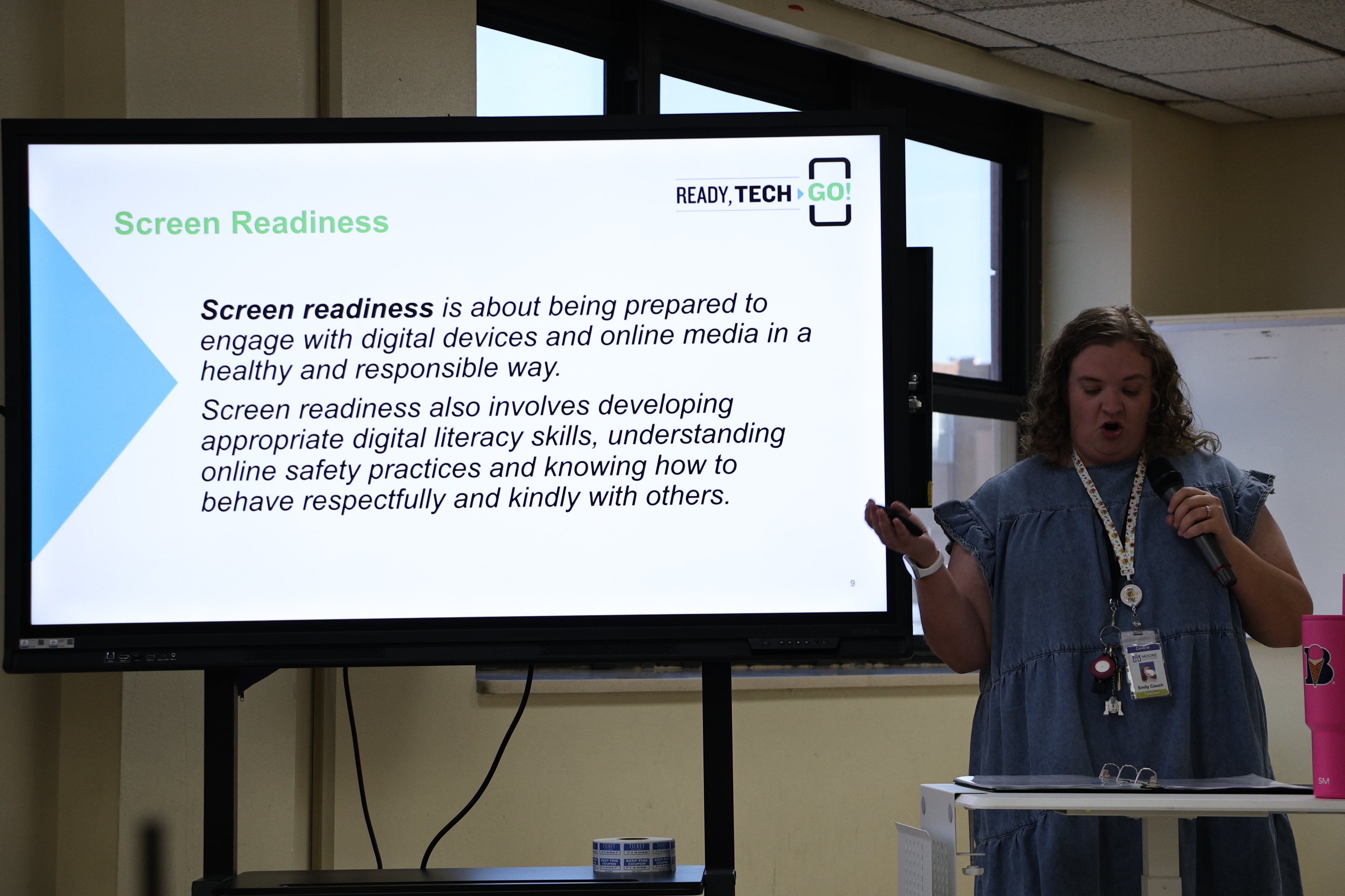 A woman in a blue shirt is standing in front of a projection screen displaying text about a %22Ready Tech. Go!%22 workshop for parents and students.