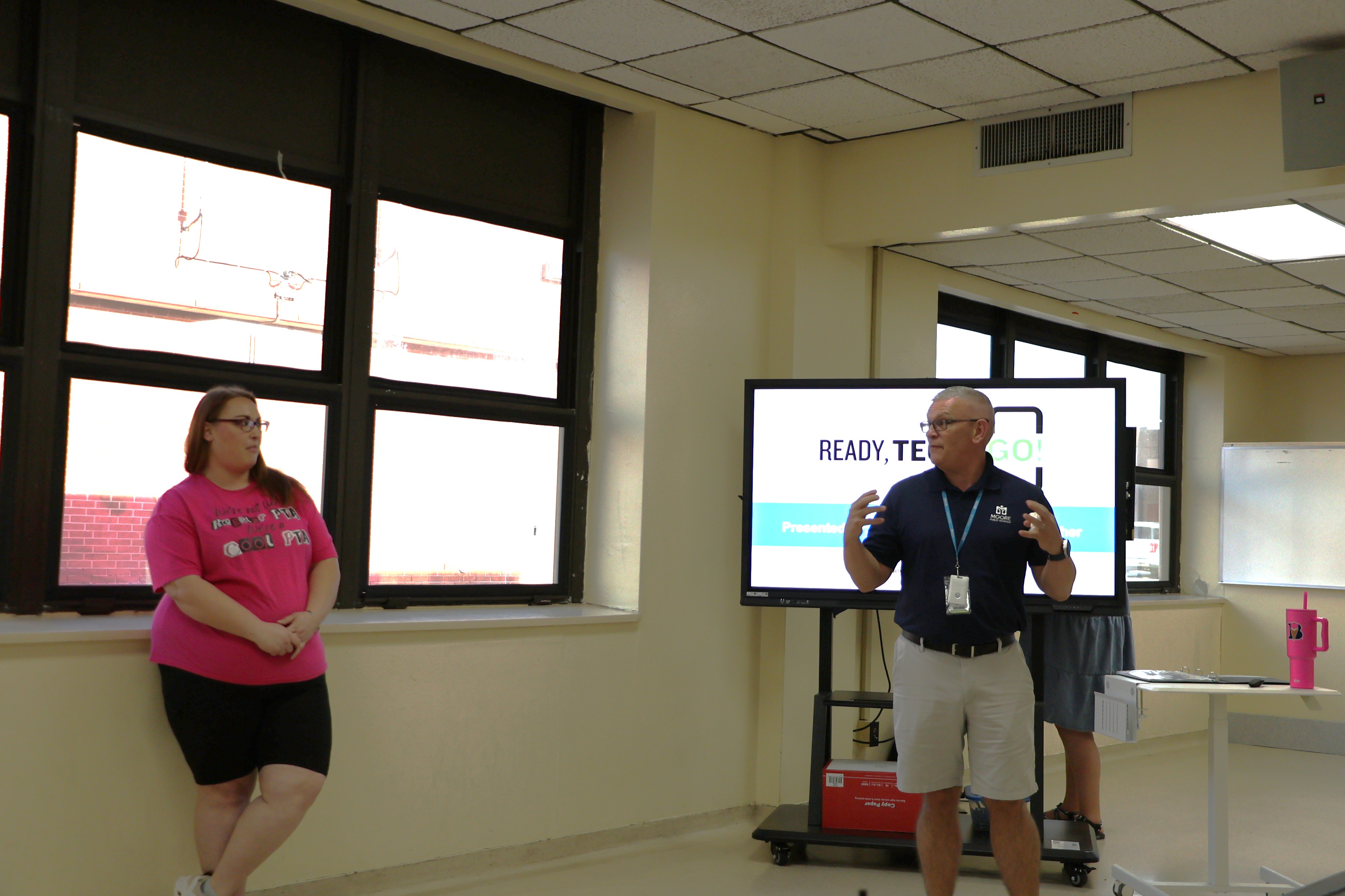 The image shows a classroom setting with two individuals, a woman in a pink shirt and a man in casual attire, standing in the foreground, while a display screen is visible in the background.
