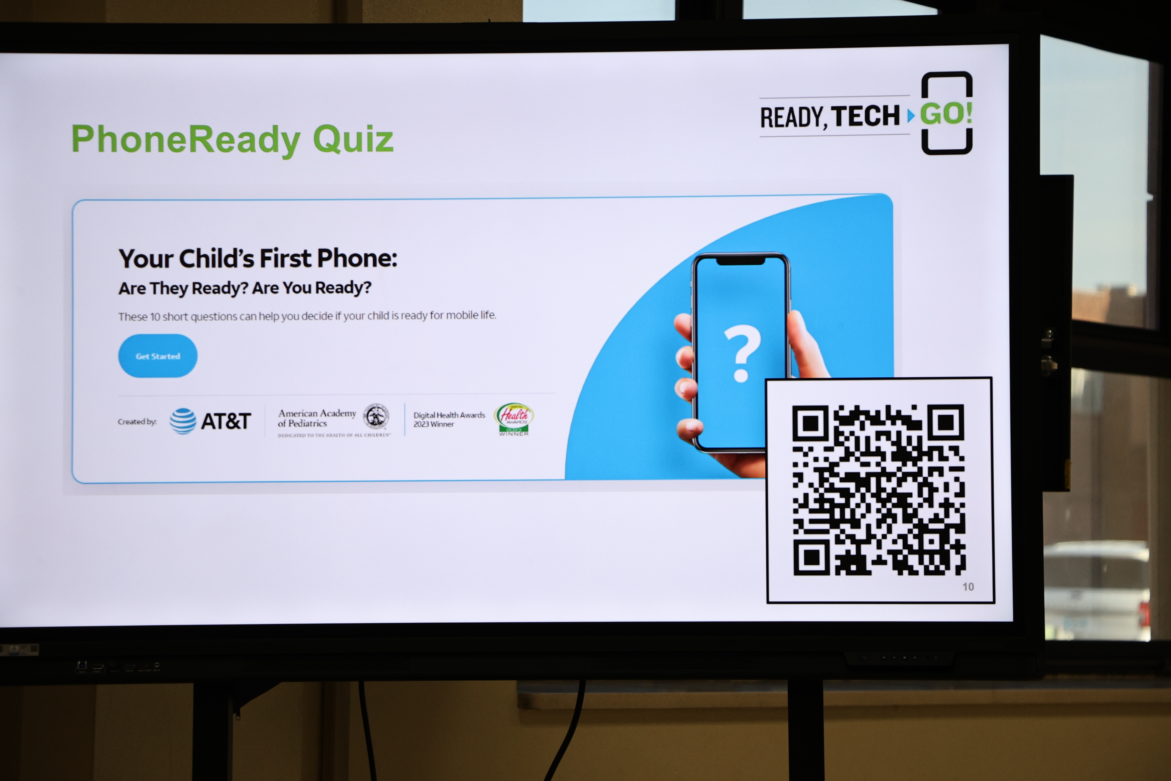 The image displays a screen with a %22PhoneReady Quiz%22 title, a question about a child's first phone, and a QR code.