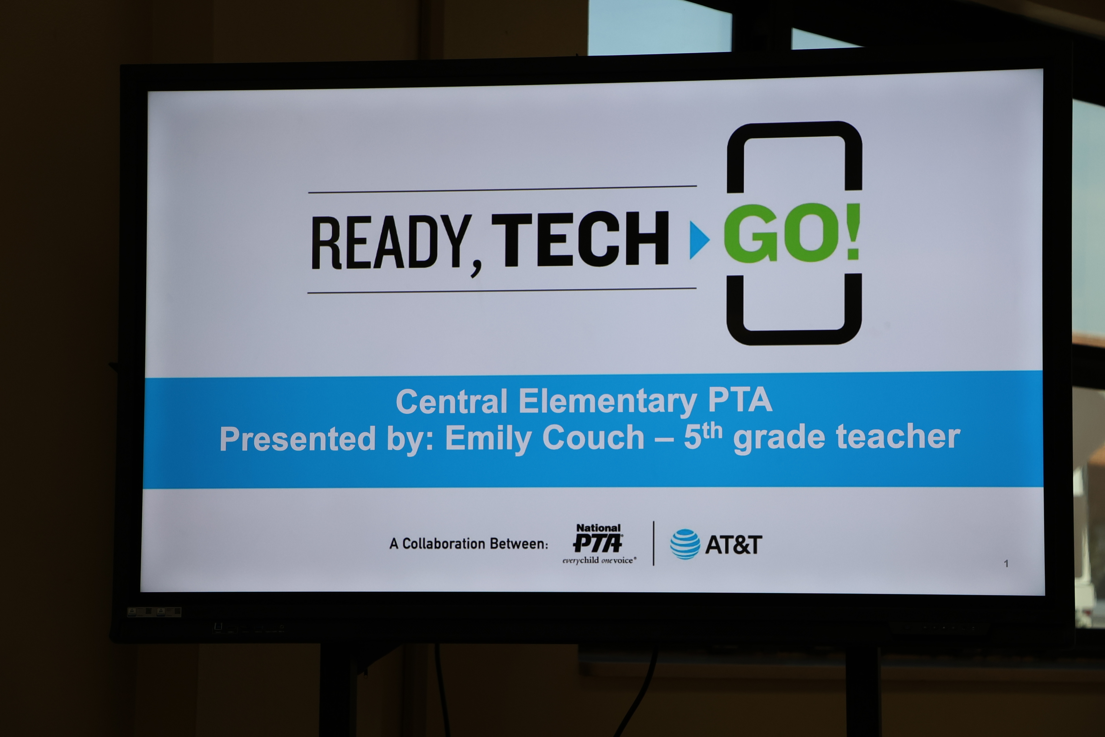 The image displays a presentation slide with the title %22Ready, Tech > Go!%22 and information about a Central Elementary PTA event presented by a 5th grade teacher named Emily Couch. The background of the slide appears to be a dark room or setting.