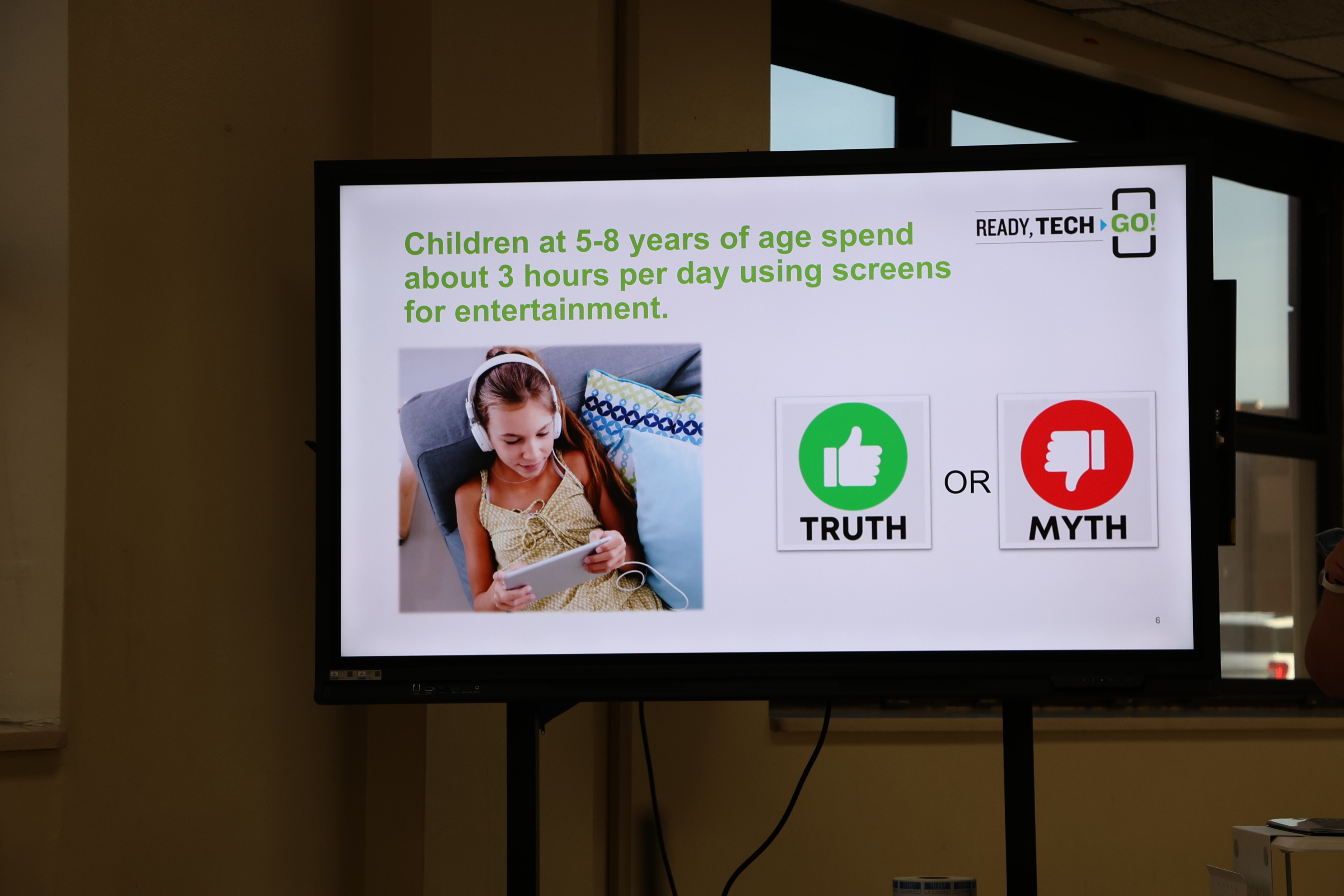 The image displays a presentation slide showing a young girl using a digital device, with the text %22Children at 5-8 years of age spend about 3 hours per day using screens for entertainment%22 and two options labeled %22TRUTH%22 and %22MYTH%22.